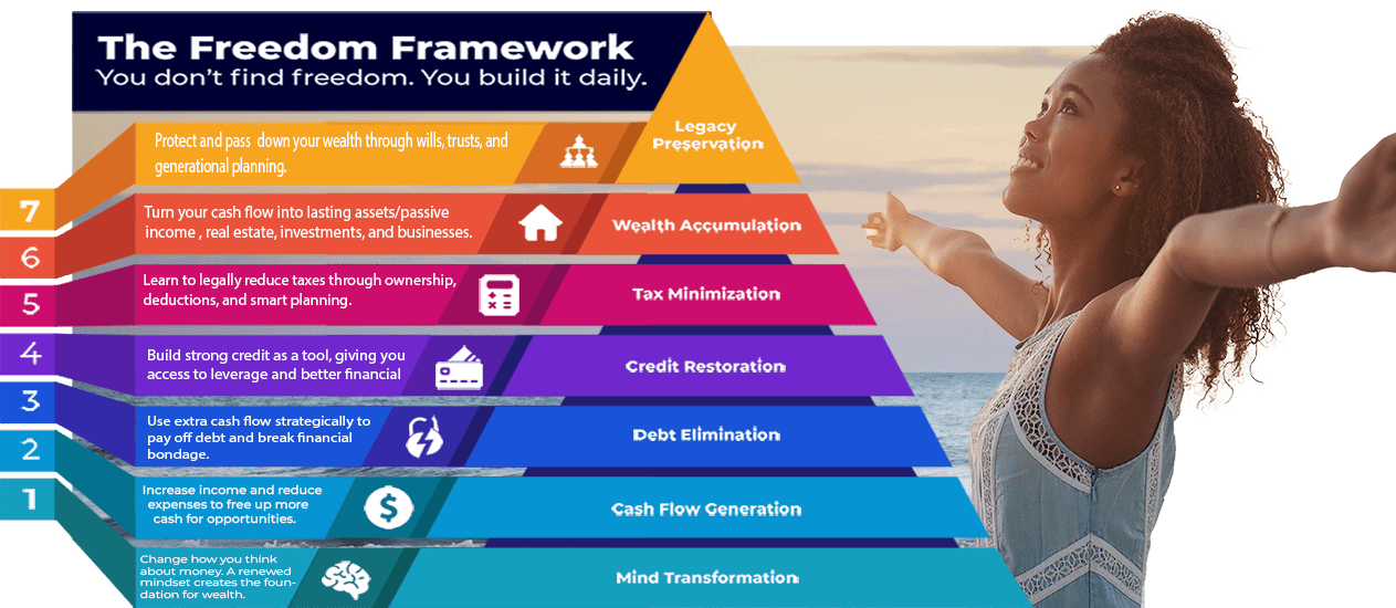 Follow the seven pillars to strengthen credit, eliminate debt, increase income, and build passive wealth.